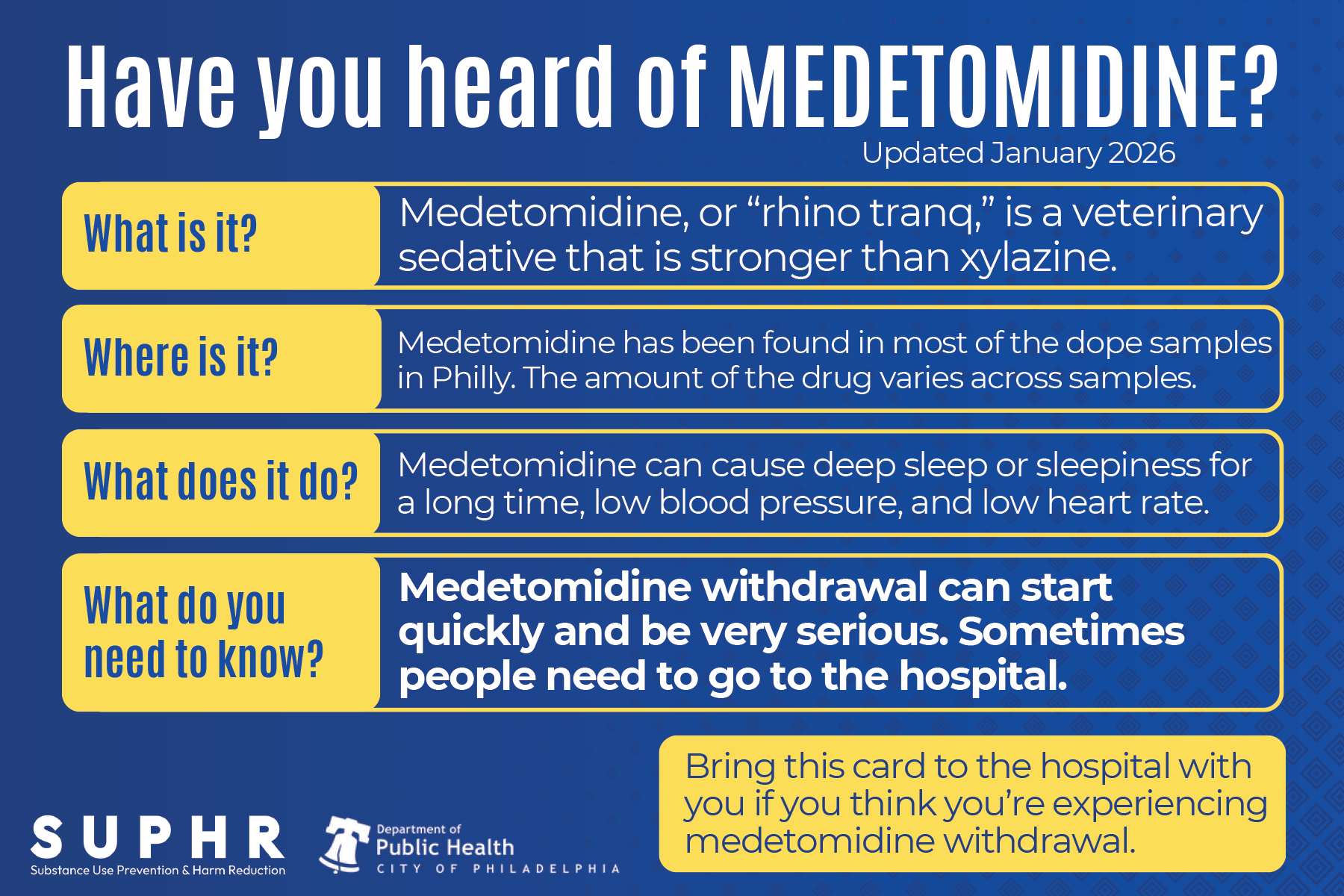 This page is currently under development. Information regarding medetomidine, its effects, and treatment and harm reduction recommendations are still developing. Resources for community members, non-medical organizations, and healthcare providers will be available on this page as it becomes available. If you have any questions about information or material on this page, contact DPH.Opioid@phila.gov.