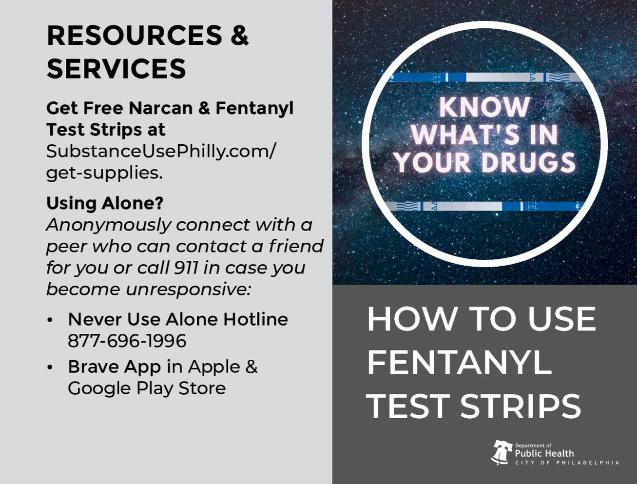 Get Free Narcan & Test Strips at SubstanceUsePhilly.com/ get-supplies.
